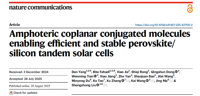 近日,湖北大学新能源与电气工程学院张旭副教授团队在国际顶级期刊《Nature Communications》发表题为《Amphoteric coplanar conjugated molecules enabling efficient and stable perovskite/silicon tandem solar cells》的研究成果。湖北大学为第一单位,硕士研究生杨丹为论文第一作者,湖北大学张旭副教授,中国科学院大连化学物理研究所王开研究员、刘生忠研究员和上海大学马静副研究员为共同通讯作者。