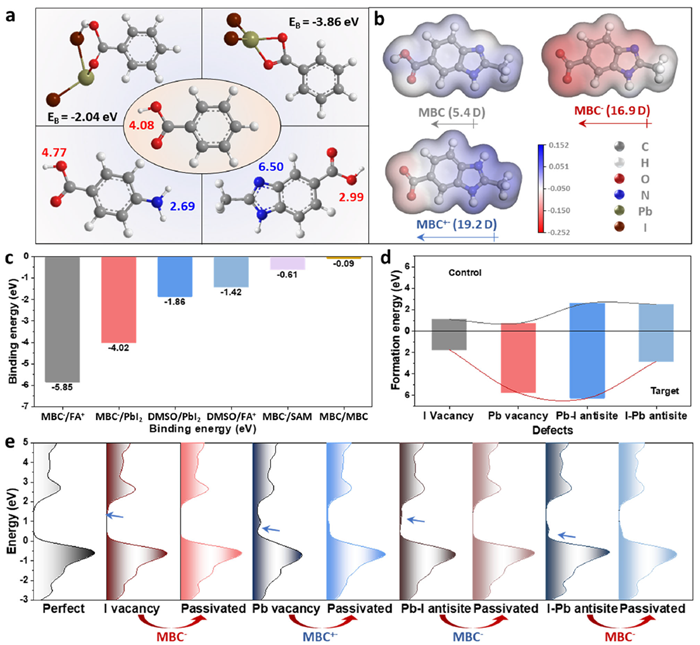 本研究创新性地设计了一类两性共面共轭分子,并选取2-甲基-3H-苯并咪唑-5-羧酸(MBC)作为代表性添加剂。MBC分子兼具羧基(–COOH)和咪唑环(–C3N2H3)功能团,其酸性和碱性特征可同时与带正电和负电的缺陷相互作用,从而实现对浅能级与深能级缺陷的协同钝化。同时,MBC的π-堆积作用和较大的分子偶极矩,使其在钙钛矿晶体生长过程中能够与前驱体物种及晶面发生强相互作用,既能延缓结晶速率、促进择优取向,又能有效降低界面无序与应力,从而获得晶粒更大、取向更优、界面更平整致密的高质量薄膜。