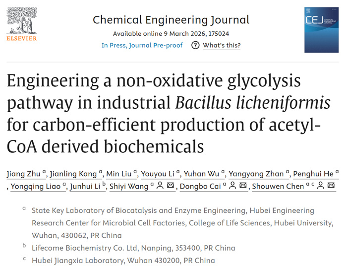 近日,Chemical Engineering Journal在线发表湖北大学生命科学学院陈守文教授课题组题为“Engineering a non-oxidative glycolysis pathway in industrial Bacillus licheniformis for carbon-efficient production of acetyl-CoA derived biochemicals”的研究论文。在生物炼制过程中,如何最大化底物利用率并减少碳排放是生物制造领域面临的核心挑战之一。传统糖酵解(EMP)途径中,葡萄糖转化为乙酰辅酶A(Acetyl-CoA)时,...
