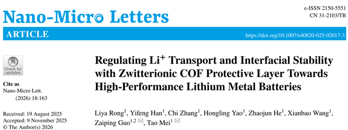 近日,湖北大学新能源与电气工程学院梅涛教授团队在国际顶级期刊《Nano-Micro Letters》发表题为《Regulating Li+ Transport and Interfacial Stability with Zwitterionic COF Protective Layer Towards HighPerformance Lithium Metal Batteries》的研究成果。湖北大学为第一单位,2023级博士研究生戎丽雅为论文第一作者,香港城市大学郭再萍院士、湖北大学梅涛教授为共同通讯作者。